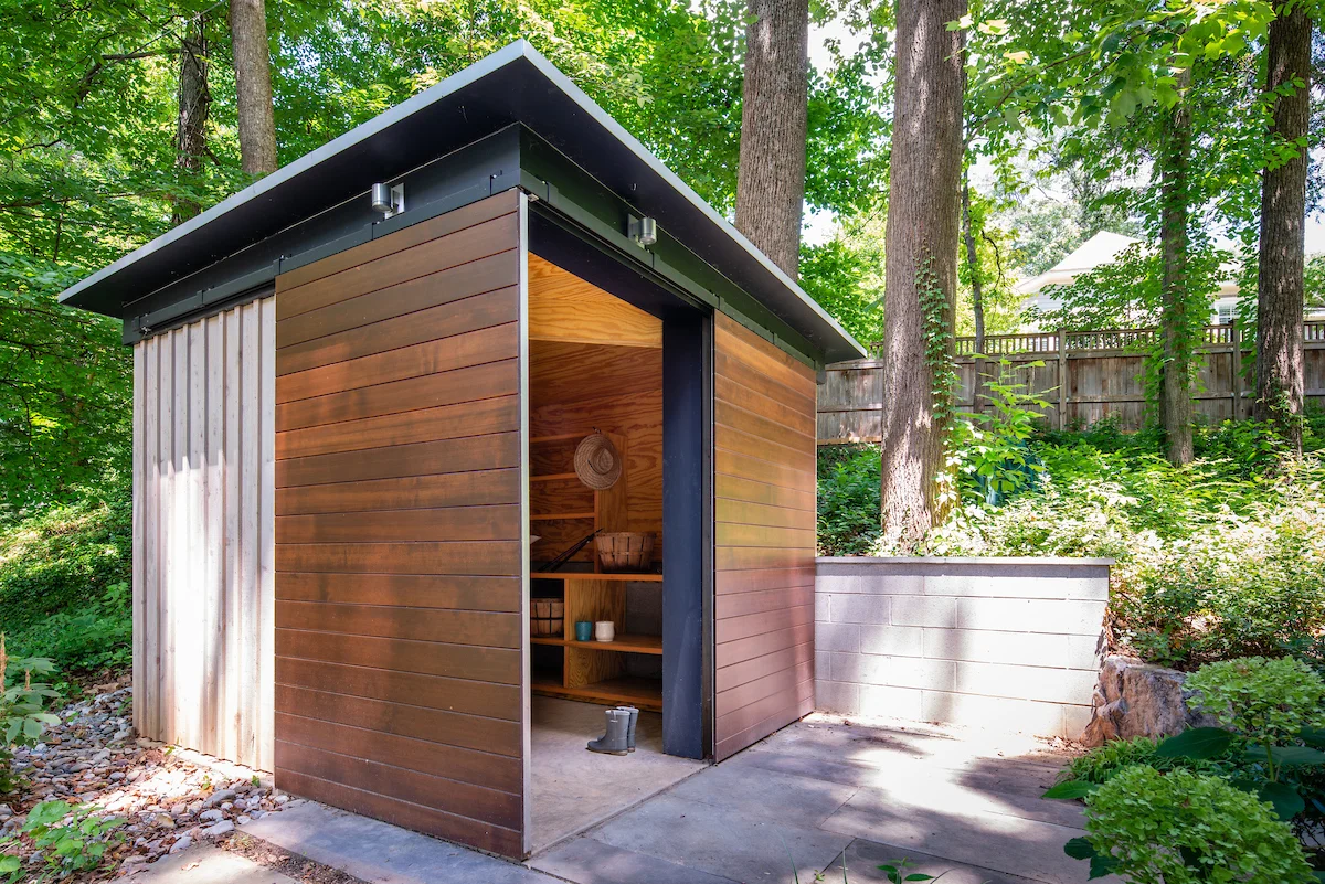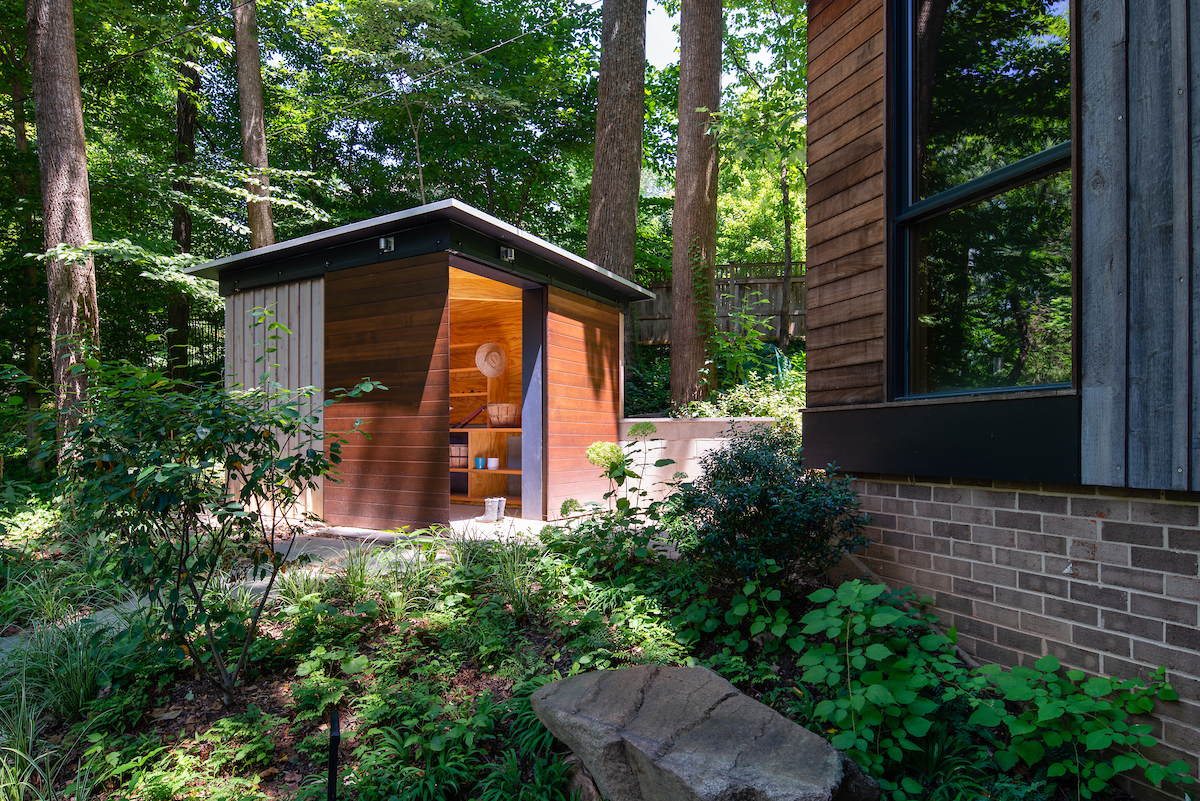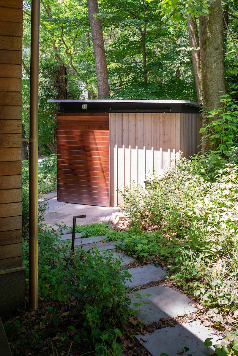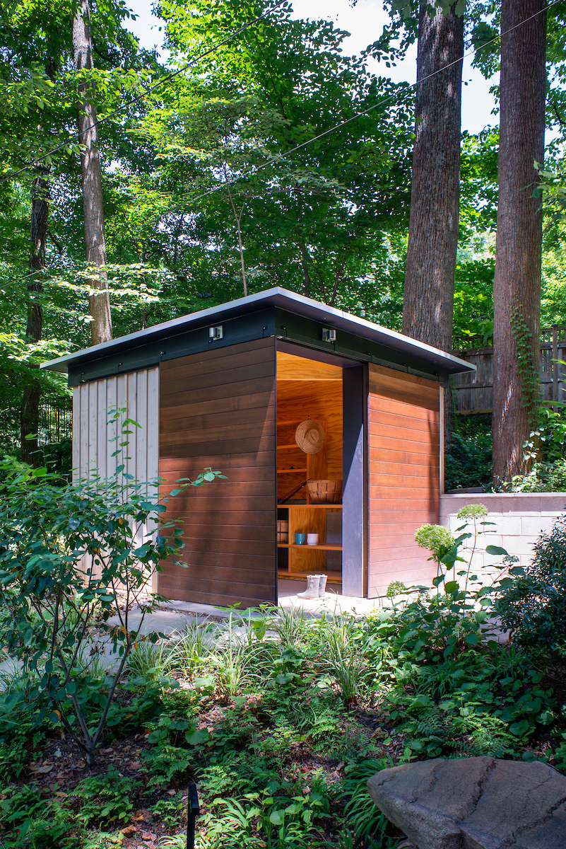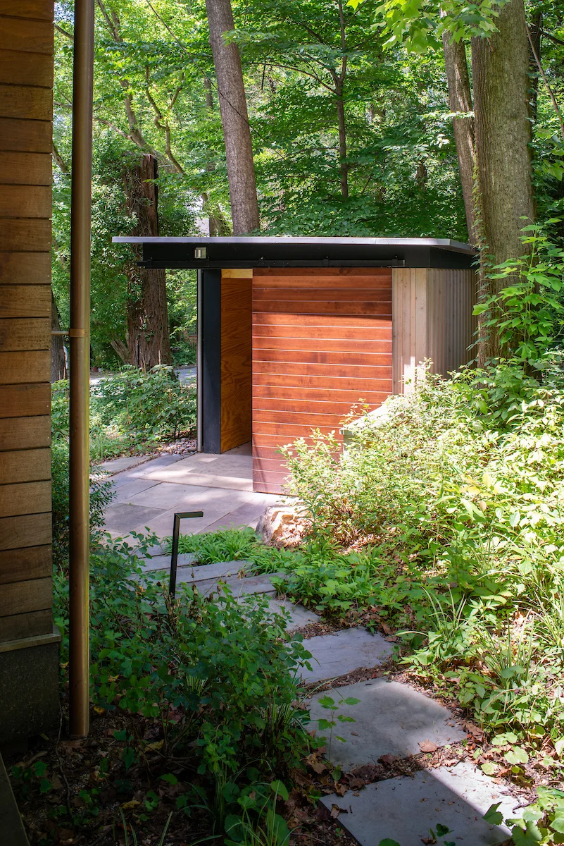 The Shed was designed to complement the house and shape an entry space. Combined with landscaping and terraced steps, the Shed is a welcoming pavilion in the landscape.