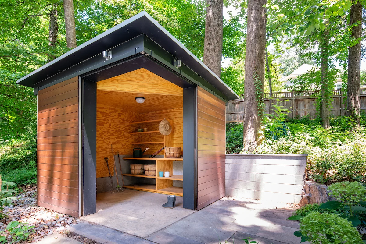The Shed itself augments the existing building. Built without a garage, and without an amenity such as a walk-out basement, the house lacked the means for practical storage of maintenance equipment and other items. The homeowner desired a freestanding shed that would accommodate equipment such as garden hoses, tools, a wheelbarrow, and bicycles. The zoning restrictions on the site were strict; combined with the topography the Shed had to be placed in what seemed like the front yard.